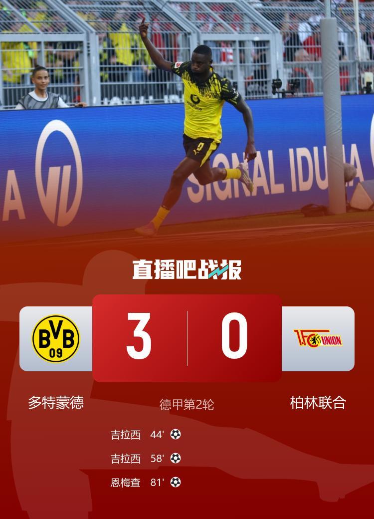 直播吧9月1日讯 北京时间8月31日23点30分,德甲第2轮,多特蒙德在主场伊杜纳信号公园球场迎战柏林联合。上半场,吉拉西单刀被扑后抢点打进一球。下半场,吉拉西完成双响,恩梅查替补建功。最终多特蒙德3-0击败柏林联合,取得赛季首胜。